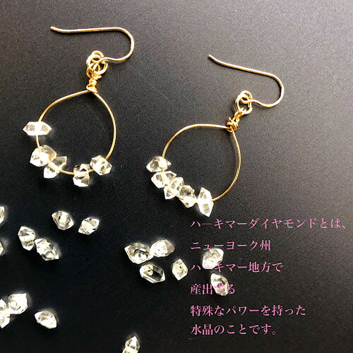 商品詳細 アーティスティックワイヤーに小さなハーキマーダイヤモンド5粒ずつ通し、小さなフープを作り、14kgfフックに付けました 使いやすくとても美しいキラキラ輝く天然石のピアスです ハーキマーダイヤモンドとは? ハ―キマーダイヤモンドとは、ニューヨーク州ハ―キマー地方で産出する特殊なパワーを持った水晶のことです。