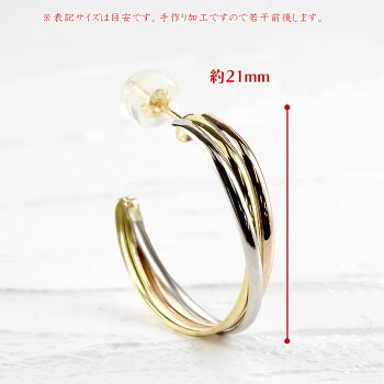 もっと贅沢に!ご満足いただけるジュエリーのオプションはこちら 840円〜 お勧めポイント どんなスタイルにもマッチするスッキリとしたデザインの地金スタッドピアス 3色のコンビネーションが動くたびに煌めく頑張っている自分へのご褒美や、大切な人へのプレゼントにおススメ 材質 イエローゴールドk18 ピンクゴールドk18 プラチナ900(品質を保証するK18 pt900の刻印) 大きさ 外径 約21ミリ ※0640110033 ジュエリー用のケースにセットしてお届け。
