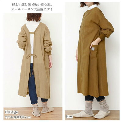 後ろ前に羽織ってコート風にもアレンジ! 洋服を着るように楽しめて、 「ちょっとそこまで」にもかわいく 着られるエプロン!体形を選ばずオシャレに着こなせます。