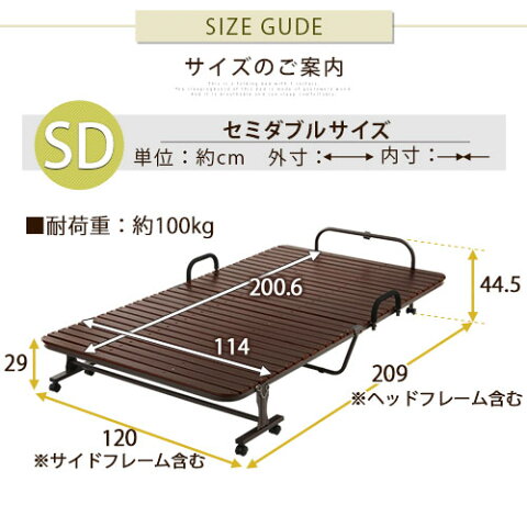 (サイズ、キャスター、すのこ枚数等を変更) ■商品サイズ(単位:約mm) ■商品外寸 ベッド時:幅1200×奥行2090×高さ445 折りたたみ時:幅470×奥行1200×高さ1093 ■商品重量:約24.5kg ■梱包サイズ:幅1200×奥行1060×高さ130 ■梱包重量:約26.7kg ※組立方によっては、完成した商品サイズに多少の誤差が発生する場合がございます。