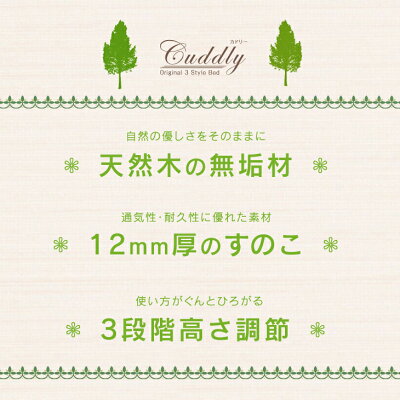 ▼組み立て動画はこちら▼ ▼サイズ違いはこちら▼ 送料無料 8,999円 送料無料12,999円 送料無料14,999円 ▼ ワンランク上のこちらもオススメ ▼ 宮棚&ブックシェルフ付 宮棚付き USB・2口コンセント付き ローベッド 仕様 サイズ 外寸: 幅120×奥行き200×高さ約34or21or8cm すのこ厚:1.2cm すのこ幅:7cm すのこ間隔:6.5cm フレーム厚:2cm 脚:高さ13×幅6cm 【スタッフわんちゃんのおすすめポイント!】 ・通気性抜群のすのこ素材 ・安定感抜群の極厚12mmすのこ ・お部屋のスタイルに合わせて3段階で高さ調節が可能な継脚タイプ ・ベッド下を有効活用できるハイスタイル ・安定感のあるミドルスタイル ・お部屋を広く見せるロースタイル ・自然のぬくもりを感じる天然木 パイン無垢材 ・本体と脚用にそれぞれ傷防止フェルト付属 ・子供にも安心・安全のFフォースターランクの塗料を使用 重量 約22.5kg 耐荷重 約200kg 素材 本体・脚:天然木パイン無垢材 すのこ:LVB(厚み12mm) ラッカー塗装 ※傷防止フェルト付属 カラー ブラウン、ホワイトウォッシュ、ナチュラル 梱包サイズ 128x34x17.5 生産国 ベトナム 送料 【送料無料(北海道・沖縄県・離島は送料別途)】 ※北海道・沖縄県・離島の場合はお問い合わせください。