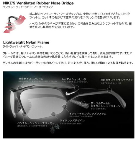 (交換用レンズ別売り) ・ラバーグリップ:テンプル内側にグリップ性の高いラバーが施され快適なフィッティングを実現 ・ベンチレーションノーズパット:通気性に優れ、汗によるレンズのくもりやサングラスのずれ落ちを軽減します。