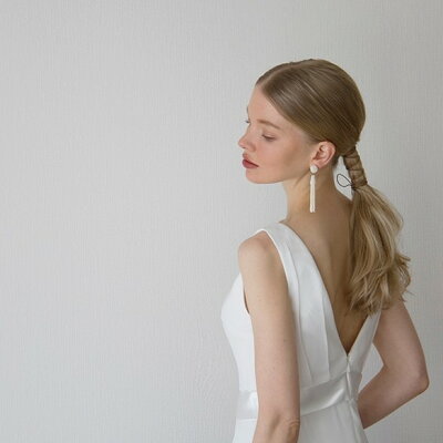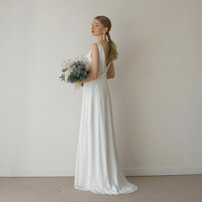 前の露出は最低限に抑え、後ろを大きく開けた大人デザイン シンプルながらも生地は3層になっており内側は上質なブライダルサテンで透け感も無く、上から重ねたシフォンも素材の良さにこだわった柔らかな生地で落ち感も抜群です 小さなトレーン付が美しく後ろ姿のお写真が自慢になること間違い無しです。