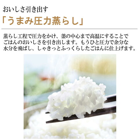 ■おいしさ引き出す「うまみ圧力蒸らし」 蒸らし工程で圧力をかけ、釜の中心まで高温にすることでごはんのおいしさを引き出します。